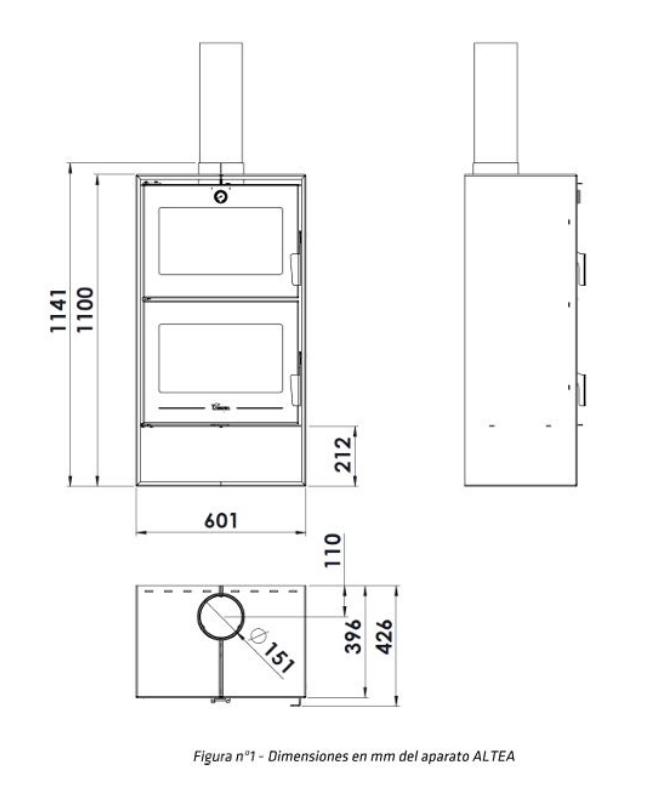 Amb unes dimensions aproximades de 60 cm d’amplada, 110 cm d’alçada i 40 cm de profunditat, i un pes de 126 kg, la Lacunza ALTEA ofereix una presència sòlida i elegant que s’integra fàcilment en entorns rústics o contemporanis. La sortida de fums de 150 mm garanteix una evacuació eficient i segura.