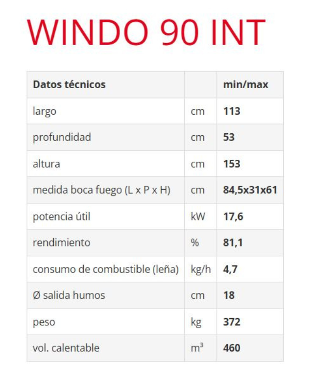 Volum estimat que pot calefactar: fins a ≈ 460 m³ (segons condicions indicades pel fabricant per al model Windo 90)