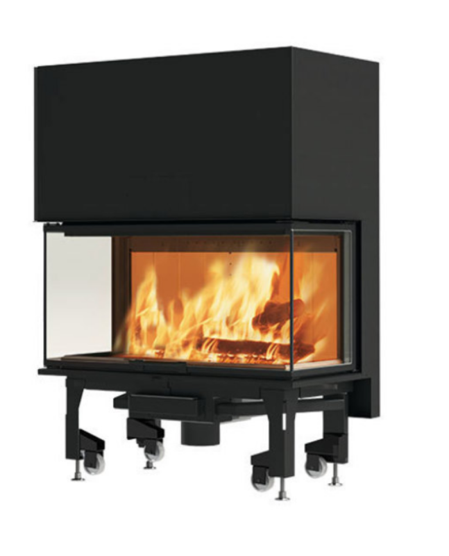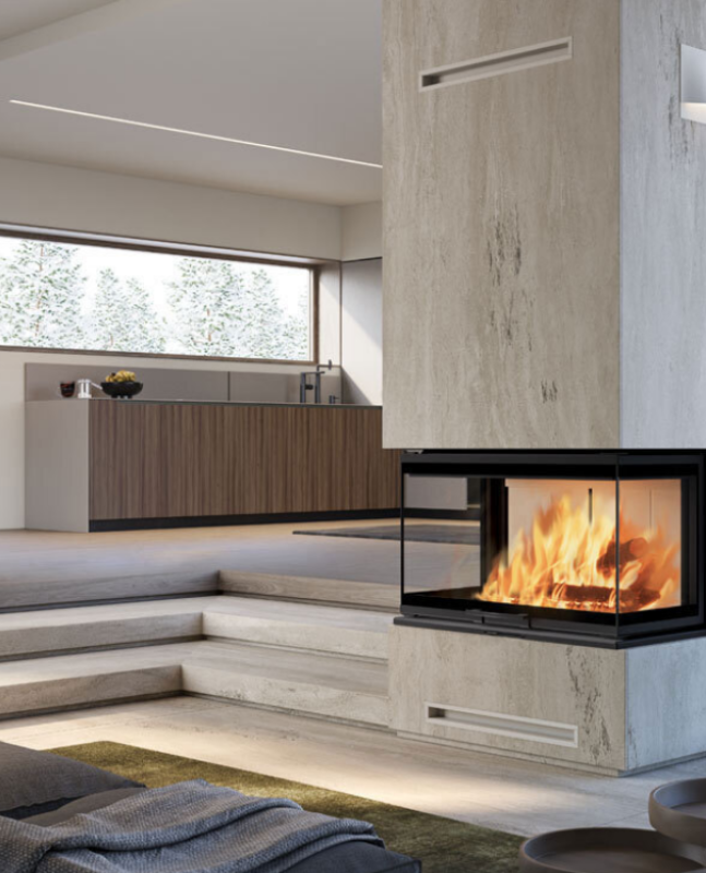 La Windo3 85 és una llar de foc de llenya amb vidre en tres cares i porta elevable, dissenyada per oferir una visió panoràmica del foc des de múltiples angles. Amb una potència útil de 13,2 kW i una eficiència superior al 84 %, és ideal per a espais de fins a 345 m³. Combina un disseny refinat amb una combustió neta i opcions de canalització d’aire.