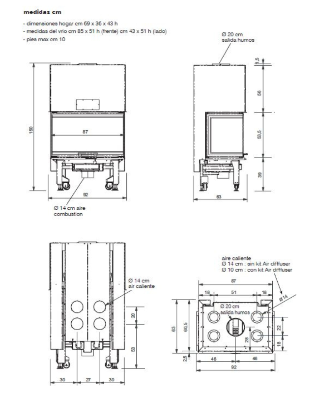 • Dimensions de la cambra de combustió: 690 × 360 × 430 mm