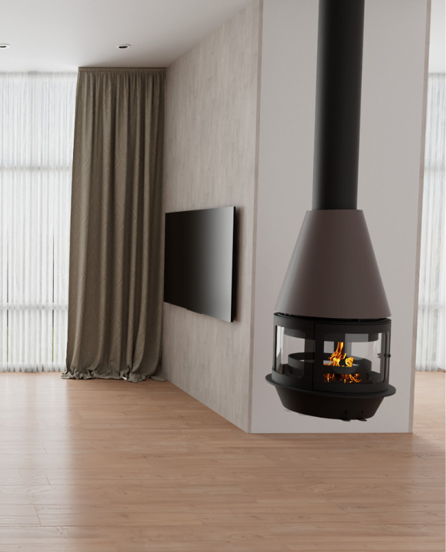 Està disponible en diverses versions: central, frontal, amb peus o suspesa, permetent adaptar-se a diferents tipus d’habitacions i configuracions. La xemeneia ofereix una gran visió de la flama gràcies al seu vidre panoràmic i permet utilitzar diversos tipus de combustible, com llenya, gas o bioetanol.