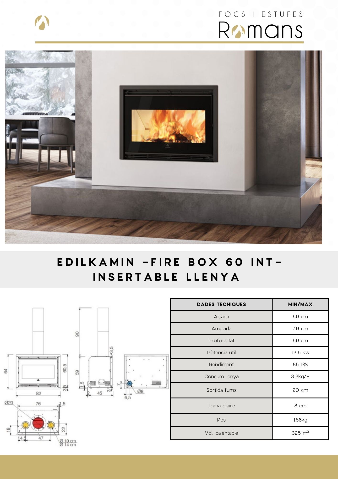 L’Edilkamin Fire Box 60 INT és un insertable de llenya dissenyat per oferir màxima eficiència i confort en la calefacció d’espais domèstics. Amb unes dimensions compactes i una estructura robusta d’acer i refractari, garanteix una elevada durabilitat i una difusió òptima de la calor. La seva cambra de combustió tancada permet una combustió més completa i neta, reduint emissions i millorant el rendiment energètic. Gràcies al seu vidre ceràmic resistent a altes temperatures, ofereix una àmplia visió de la flama, creant un ambient càlid i acollidor. És una solució ideal per renovar una llar de foc tradicional o integrar-se en un projecte modern de calefacció sostenible.