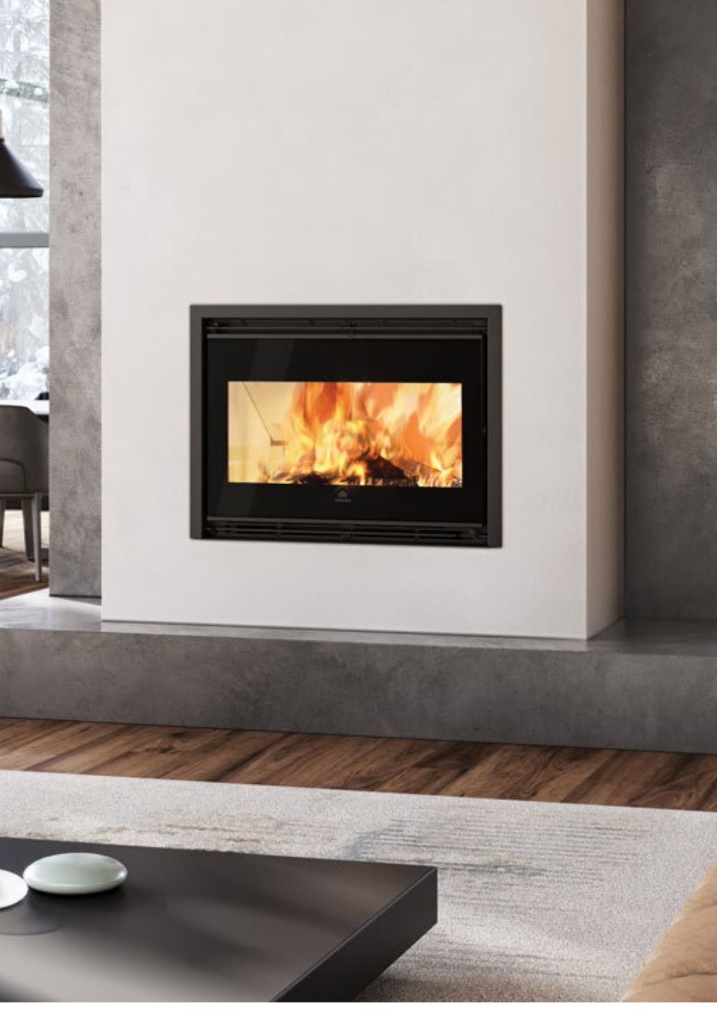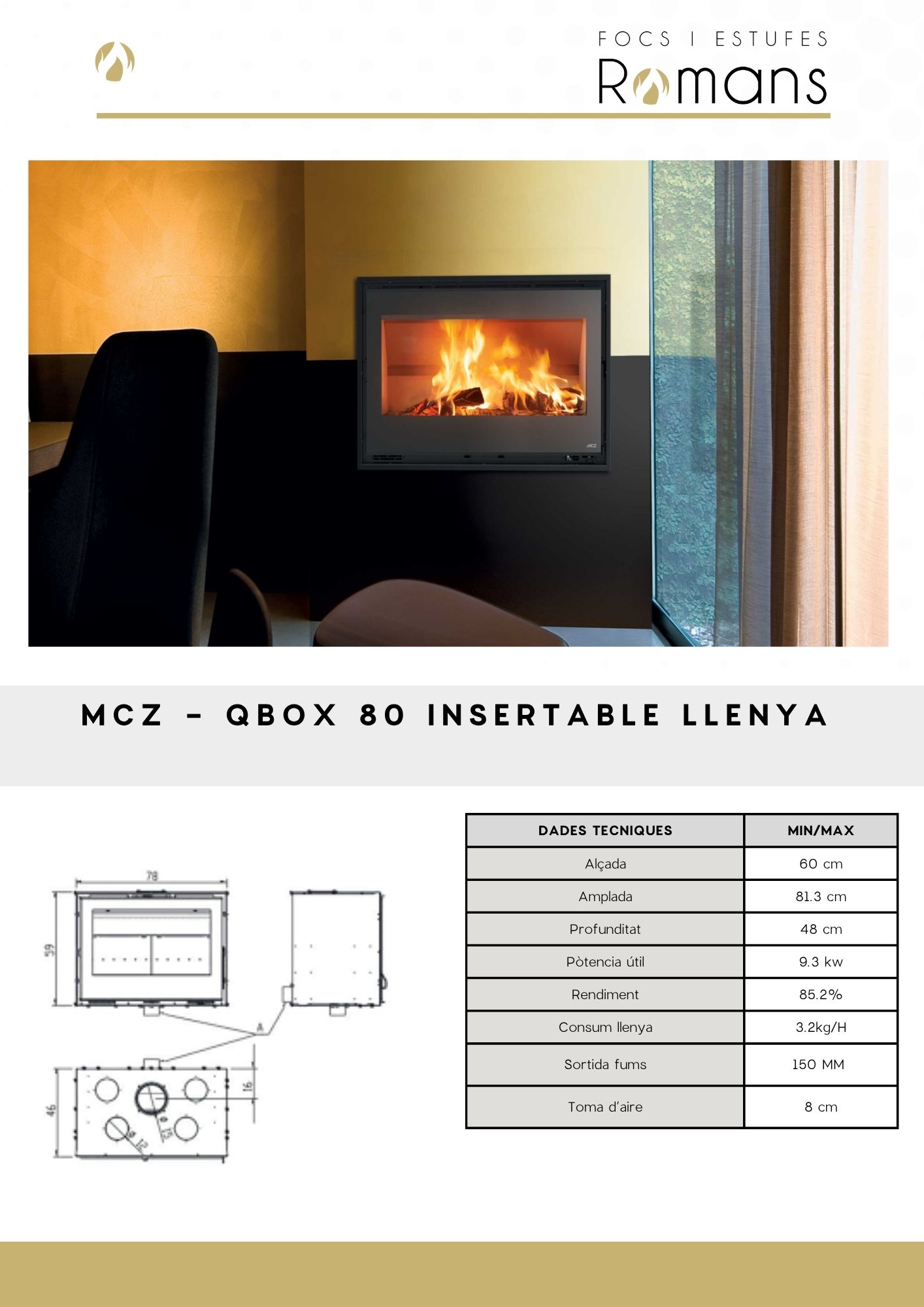 L’MCZ QBOX 80 WOOD és un insert de llenya d’alta eficiència i baix perfil que combina un disseny compacte amb ventilació frontal silenciosa, pensat tant per a substituir una xemeneia oberta com per a nova instal·lació.