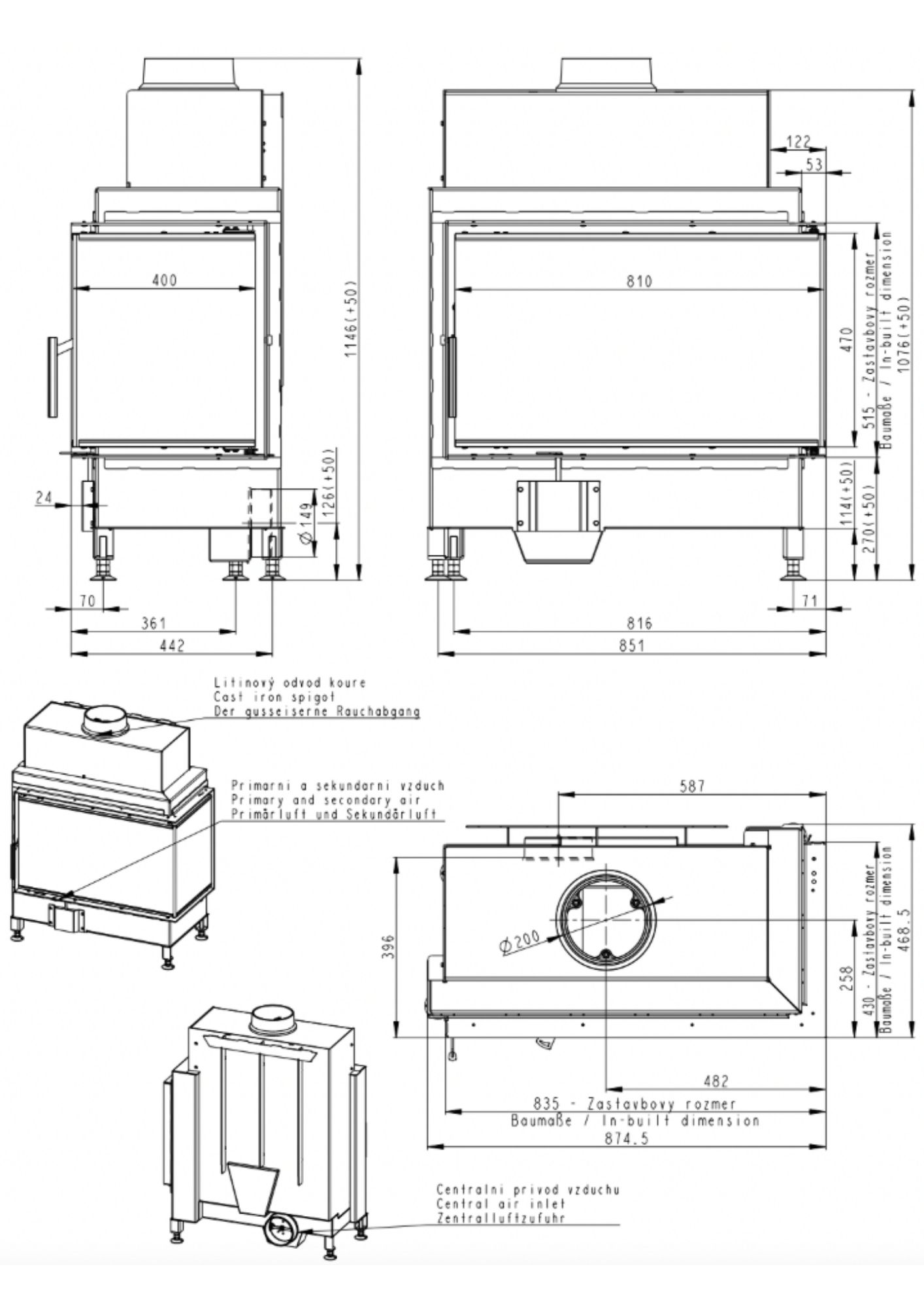 Equipat amb una sortida de fums de 200 mm i una toma d’aire exterior de 150 mm, permet una evacuació de gasos de combustió estable i una aportació controlada d’aire fresc per mantenir la combustió eficient i independent de l’aire interior de l’estança. La cambra de combustió està completament revestida amb material refractari, optimitzant la retenció de calor i la durada de la temperatura interna durant tot el cicle de funcionament.