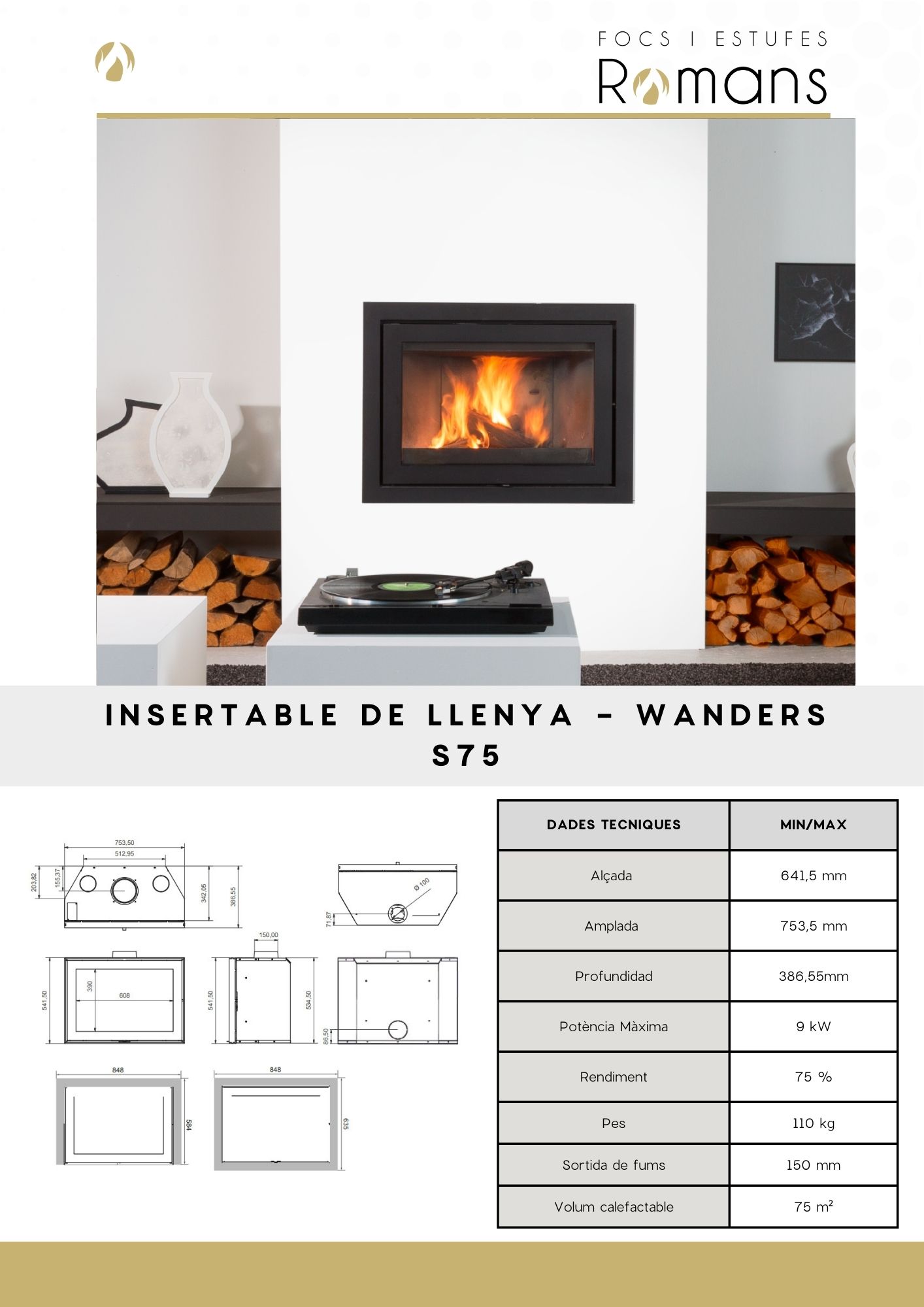 La Wanders S75 és un insertable de llenya amb potència calorífica d’uns 9 kW, ideal per a calefacció central de llar, amb rendiment aproximat d’un 77–78 % i sortida de fums superior o posterior. Les dimensions útils d’encaix són aproximadament 753,5 mm d’amplada × 386,6 mm de profunditat × 541,5 mm d’altura, amb diàmetre de sortida de fums de 150 mm i interior molt aïllat per millorar l’eficiència de combustió.