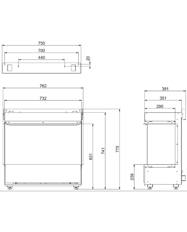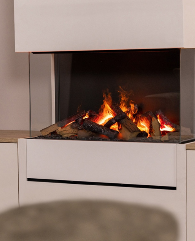 Aquesta xemeneia està pensada per ser adaptable i es pot instal·lar de tres maneres diferents: amb una sola cara visible, amb dues cares obertes o amb tres costats panoràmics, segons les necessitats del projecte o el disseny interior. Gràcies a aquesta flexibilitat, s’integra perfectament tant en salons particulars com en espais públics, hotels o restaurants, oferint un efecte visual espectacular des de qualsevol angle.